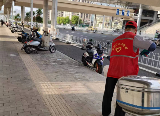 本次志愿在街的行動(dòng),以撿拾街面漂浮物垃圾為重點(diǎn),集中處置塑料垃圾,緩解早晚高峰環(huán)衛(wèi)工人的工作壓力。在社區(qū)輕軌與地鐵站交匯路口,這里是早晚高峰電動(dòng)車(chē)量聚集等待紅綠燈的集中點(diǎn),除了撿拾垃圾外,志愿者們還進(jìn)行了環(huán)保宣傳,不時(shí)提醒車(chē)主啟動(dòng)車(chē)輛時(shí)要注意周邊路況。