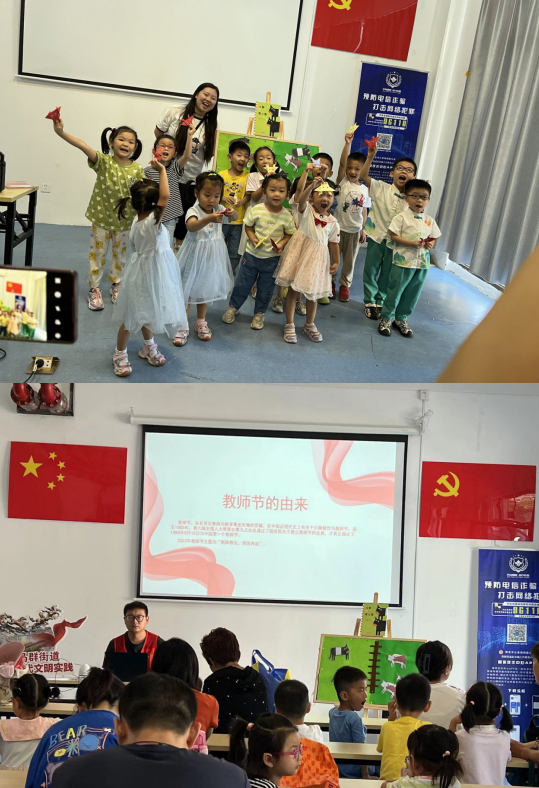 教師節(jié)之際,社區(qū)工作人員順勢(shì)講解教師節(jié)的含義及由來,傳遞尊師敬師傳統(tǒng)文化。隨后,老師采用PPT的形式給大家展示《勇敢的克蘭西》故事,讓孩子們發(fā)揮自己的想象說出繪本里的故事和情節(jié),隨后一起思考一起講解,充分調(diào)動(dòng)了大家學(xué)習(xí)閱讀觀察的積極性,也充分發(fā)揮這個(gè)年齡階段孩子的天性,引導(dǎo)青少年樹立正確的人生觀和價(jià)值觀。繪本故事講完,老師還和小朋友一起做了手工活動(dòng),給小朋友提供備好的剪刀、紙張、彩條等材料,細(xì)心講述制作的步驟,小朋友們?cè)诶蠋煹闹笇?dǎo)下將彩條進(jìn)行粘貼,利用模板形狀進(jìn)行裁剪,很快“勇敢的克蘭西”就制作成功了。