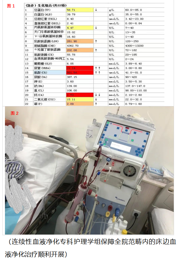 經(jīng)病友推薦,得知江寧中醫(yī)院神經(jīng)外科在腦出血診治方面經(jīng)驗豐富,家屬一番商量后,將患者送往該院治療??紤]到患者既往有尿毒癥病史,急查腎功能,提示肌酐500umol/L以上(圖1)。神經(jīng)外科醫(yī)生聯(lián)系腎病科宋揚主任會診后,鑒于患者腦出血術(shù)后,且行動不便,建議患者行床邊無肝素透析方案(圖2),每隔一天執(zhí)行一次。然而,透析時又遇新的困難,患者左前臂動靜脈瘺處無法進行滿意透析,經(jīng)血透室王桂花護士長及腎內(nèi)科醫(yī)護人員共同協(xié)作,行右下肢股靜脈穿刺,最終成功實施透析。定期復查腎功能,提示腎功能改善明顯。