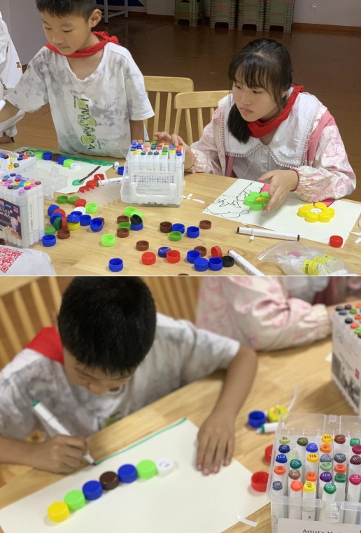 活動(dòng)現(xiàn)場(chǎng),孫老師和社區(qū)的青少年們傾心設(shè)計(jì),巧妙地將廢舊瓶蓋轉(zhuǎn)化為珍貴的藝術(shù)品。有些孩子用瓶蓋巧妙地拼接成了可愛的毛毛蟲,仿佛春天在指尖舞動(dòng);還有些孩子以瓶蓋點(diǎn)亮蘋果,讓其散發(fā)出迷人的光彩。大家通過賦予廢物新的價(jià)值,深刻領(lǐng)悟到環(huán)保行動(dòng)的威力。