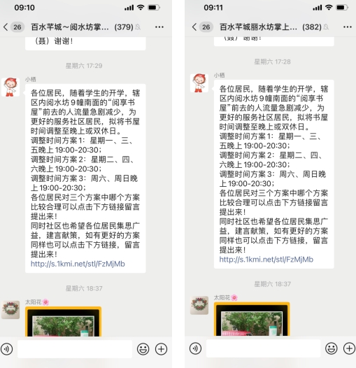 為更好的服務社區(qū)居民,以社區(qū)讀者所盼、所需為導向,有針對性地滿足群眾文化需求,百水芊城社區(qū)運用“掌上云社區(qū)”業(yè)務管理平臺,通過“小棲”機器人向小區(qū)微信群推送百水芊城小區(qū)“閱享書屋”的開放調(diào)整協(xié)商管理通知,通過線上協(xié)商留言方式邀請轄區(qū)居民集思廣益,建言獻策,在選擇好的開放方案同時也可以提出其他的方案。