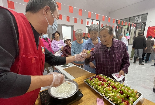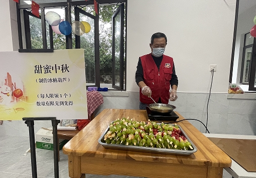 甜蜜中秋(制作冰糖葫蘆),社區(qū)志愿者為居民仔細講解了冰糖葫蘆的古老傳說和制作步驟,現(xiàn)場熬制糖稀,并邀請居民上前觀看。糖稀熬制完成后,居民用竹簽棒把各種水果串成小串,然后放進糖稀里,均勻沾滿糖漿,一串串誘人的冰糖葫蘆就制作完成了。居民們滿足地吃著自己親手制作的冰糖葫蘆,臉上洋溢著幸福的笑容。