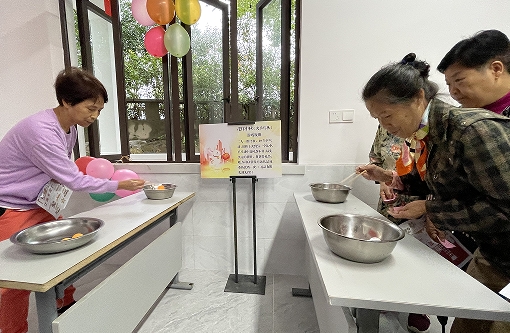 花好月圓(制作月餅),社區(qū)志愿者們將面粉、餡料、模具等一系列原材料,準備妥當(dāng),并現(xiàn)場教學(xué)。現(xiàn)場呈現(xiàn)一片繁忙的景象,居民們一邊揉搓面團,一邊壓膜,連小朋友都積極的參與進來??粗约河H手制作的月餅,大家臉上都洋溢著幸福的笑容,香甜的味道縈繞在大家鼻尖,感受著濃濃的節(jié)日氛圍。