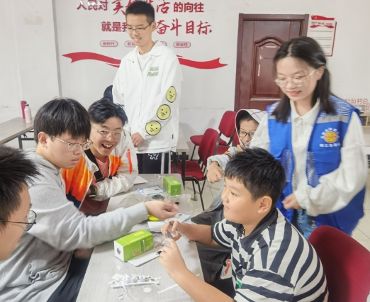 隨著主講人PPT課件與講課的進行,大家對生活中“虹吸”、“光影”、“蒸發(fā)”等物理知識進行了學習。在實驗過程中,大家根據(jù)所學的物理科普知識,在大學生志愿者協(xié)助下,完成了多項手工物理實驗裝置的安裝與運用,對今天課堂所學知識起到了鞏固作用。