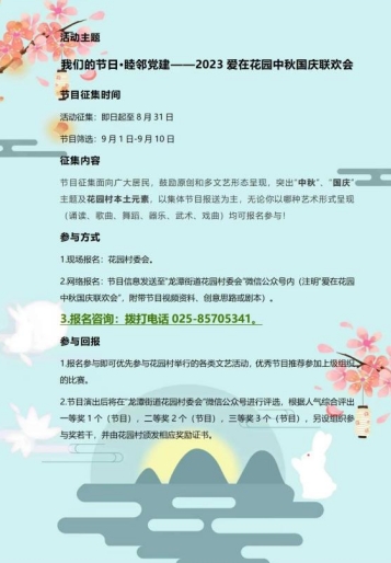 為弘揚和傳承中華民族優(yōu)秀傳統(tǒng)文化,豐富居民群眾的精神文化生活,營造濃厚的節(jié)日氛圍,花園村黨委依托掌上云社區(qū)舉辦“迎盛會 聚鄰里 黨群攜手心連心”中秋國慶文藝匯演,通過掌上云社區(qū)招募演出隊伍及志愿者,豐富演出內容。