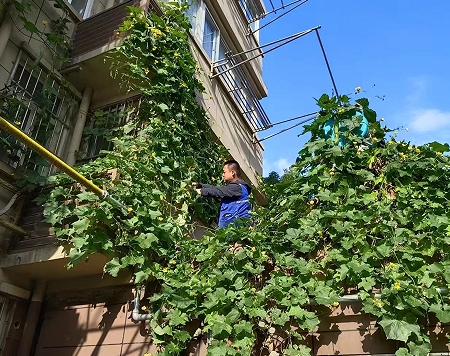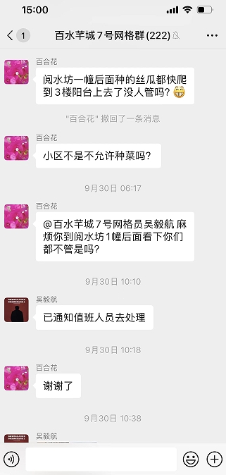 中秋、國慶雙節(jié)期間,棲霞區(qū)馬群街道百水芊城7號網(wǎng)格“掌上云”微信群接到一位居民訴求信息,反映一棵絲瓜藤長勢兇猛,已經(jīng)爬到了三樓陽臺了,希望居委會或物業(yè)部門盡快安排人員到現(xiàn)場察看并幫忙清理。