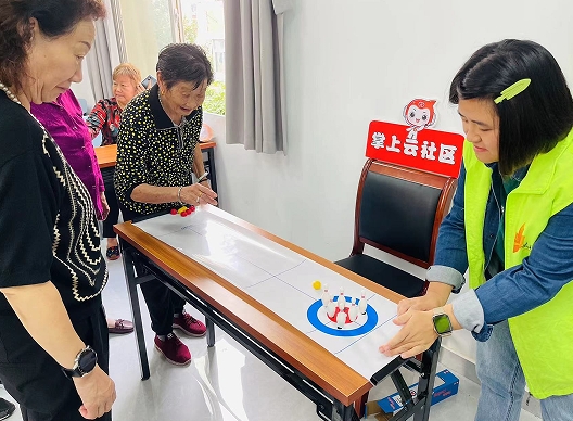 本次活動(dòng)通過(guò)“掌上云社區(qū)”進(jìn)行線上宣傳、報(bào)名。吸引了50余名老年居民參與。活動(dòng)一開(kāi)始,堯化新村社區(qū)“掌上云社區(qū)”負(fù)責(zé)人湯超先向各位居民介紹了掌上云社區(qū)目前的情況,并宣傳“掌上云社區(qū)”取得的成績(jī),呼吁居民做好群內(nèi)小主人。隨后娛樂(lè)活動(dòng)正式開(kāi)啟,桌上保齡、夾彈珠、推瓶奪寶一個(gè)個(gè)項(xiàng)目讓大家玩的不亦樂(lè)乎。其中,“推瓶奪寶”項(xiàng)目的人氣最高,大家都想一展身手,迅速在項(xiàng)目位置排起了長(zhǎng)隊(duì),活動(dòng)中,老人們個(gè)個(gè)精神抖擻,有序選擇不同的項(xiàng)目進(jìn)行娛樂(lè),老人們樂(lè)在其中,玩得盡興,他們仿佛忘記了年齡、忘記了歲月,臉上洋溢出孩童般的笑容。