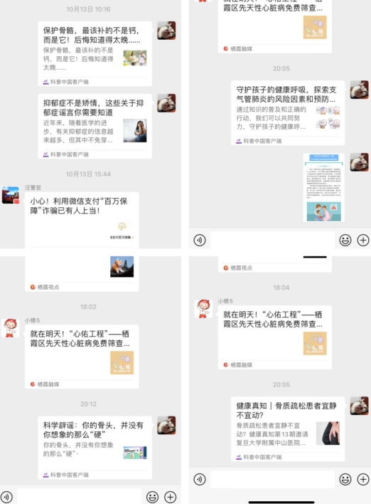 “守護(hù)孩子的健康呼吸,探索支氣管肺炎的風(fēng)險因素和預(yù)防措施.....適當(dāng)?shù)幕顒硬坏稍鰪?qiáng)肌力與肌耐力, 改善平衡、協(xié)調(diào)性與步行能力,而且可改善 骨密度、維持骨結(jié)構(gòu),降低跌倒與脆性骨折 的發(fā)生風(fēng)險等.........”社區(qū)群內(nèi),工作人員通過親情提醒、圖文科普、視頻宣教、互動交流等形式,向居民傳播健康科普小知識,讓居民隨時都可以學(xué)習(xí)健康知識,同時還實時更新當(dāng)下群眾關(guān)注的健康焦點及應(yīng)對措施,使居民能夠預(yù)防在先;“像我有高血壓的老人,以后要注意管理好自己的身體”“最近得支氣管肺炎的人挺多的,有癥狀一定要及時就醫(yī).............”群內(nèi)互動氛圍濃厚,居民紛紛留言道。