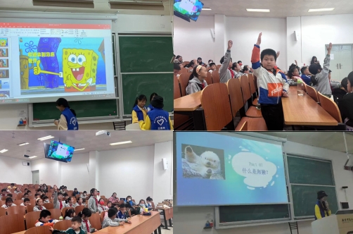 見識過海洋生物標本,小朋友們接著來到了學思樓教室,上一節(jié)關于海洋的生動課程。三位志愿者向小朋友們展示自己認真準備的ppt,生動有趣的海綿寶寶、可愛的海獺以及豐富的珊瑚,讓小朋友們完全投入其中,一段段小短片讓他們認識到更多海洋生物的秘密。積極舉手回答問題、提出自己的疑問……小朋友們在課堂上神采飛揚,毫不怯場,讓家長及志愿者們夸贊不已。