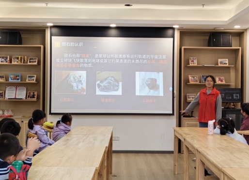 活動伊始,老師為青少年帶來了“太空環(huán)游——隕石”科普小課堂。志愿者先向小朋友們提出了“什么是隕石”的問題,讓小朋友們開始思考隕石相關的知識。隨后,志愿者從“隕石的認識”、“隕石的用處”、“隕石的成分”三個方面出發(fā),全面的科普了有關隕石的知識,讓小朋友們對隕石有深刻認識的同時也激發(fā)了青少年對大自然生命的探索欲。