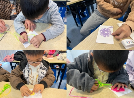 繪本故事結(jié)束后,社區(qū)志愿者繼續(xù)帶領(lǐng)小朋友們開始了“一圈一畫”創(chuàng)意毛線畫手工制作。小朋友們原先只知道毛線可以用來織毛衣,但是在今天,小朋友們利用毛線,在卡紙上一筆一筆勾勒出了屬于自己的毛線畫作品。在這些充滿童趣的作品中,我們看見了一枚桃心,一朵紫色的小花,一條在水底游來游去的小魚......每個作品都展現(xiàn)了孩子們的獨特的創(chuàng)造力,孩子們在過程中感受創(chuàng)造的樂趣與美好。