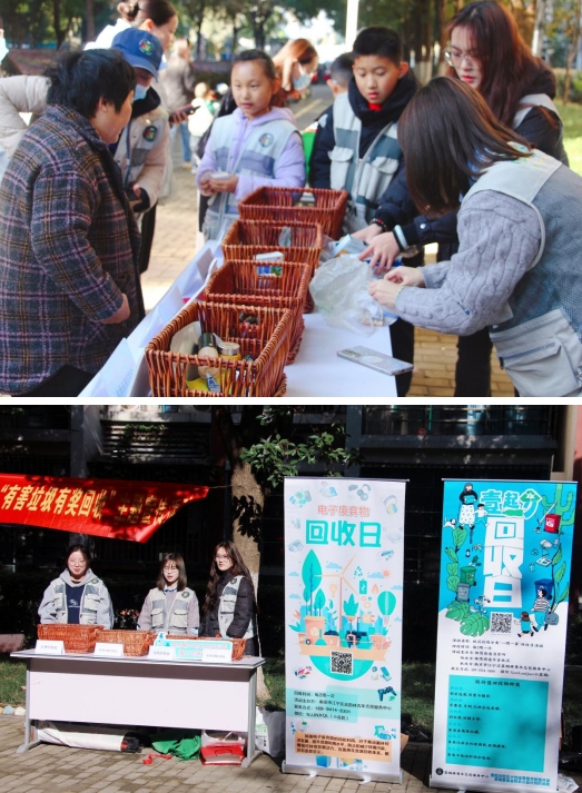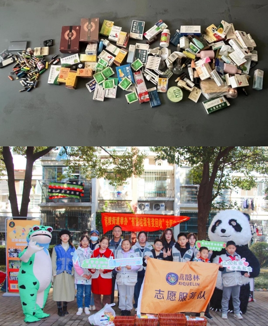 居民紛紛拿出家中的廢舊電池、廢棄燈管、廢棄化妝品瓶等交由志愿者進行回收。