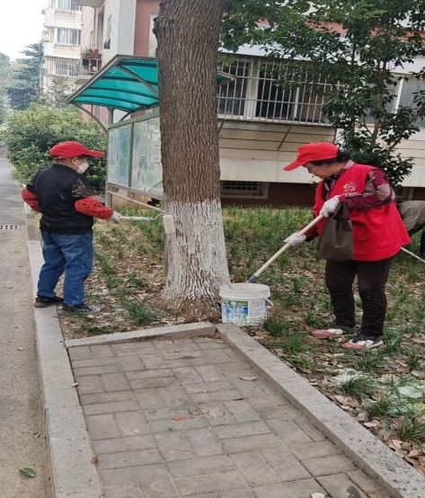 社區(qū)黨員志愿者們按要求給每棵樹標(biāo)定1.2米的基準(zhǔn)線,頂端纏繞紅色膠帶,然后利用生石灰、防蟲藥劑等混合配比液進(jìn)行刷白,刷白后不僅能夠防蟲防凍,還起到美化效果。在保護(hù)好樹木的同時,還將林帶內(nèi)的垃圾、雜物、雜草進(jìn)行清理。大家通過分工合作,耐心仔細(xì)地為大樹披上了一件又一件健康、溫暖的白色“冬衣”,為社區(qū)增添了一道亮麗的風(fēng)景線。