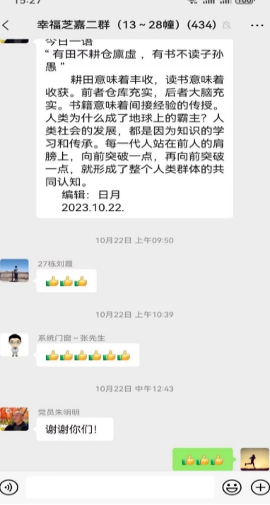 雖然這看似不起眼的小事情,但正是他的堅持讓這一切發(fā)生。尤其在2020年疫情最嚴峻的時候,居民們基本上都不外出,大多數時間都在家中刷手機。這種情況下,朱明明依舊堅持不懈,給微信群中的居民傳播每天的正能量,讓他們感受到了無盡源源的激勵。