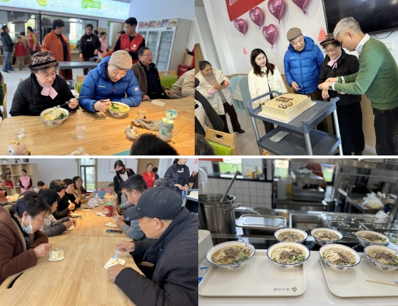 最后,志愿者們?yōu)槔先藗兌藖砹嗣牢兜纳盏案?,大家一起唱生日歌,分享蛋糕、吃長壽面,一邊品嘗美食,一邊享受這難忘的時刻。