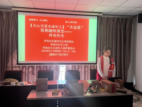 為促進(jìn)科技創(chuàng)新,普及科學(xué)知識,弘揚(yáng)科學(xué)精神,助力未成年人科學(xué)素質(zhì)的提升,南師大物科院“向心力”志協(xié)在領(lǐng)隊(duì)張潔同學(xué)的帶領(lǐng)下來到馬群街道果場社區(qū),與社區(qū)未成年人保護(hù)服務(wù)站、關(guān)工委共同依托社區(qū)新時(shí)代文明實(shí)踐站科技與科普服務(wù)平臺,借助“齊益果”掌云+積分制工作機(jī)制組織社區(qū)未成人及其家庭進(jìn)行“溫暖秋冬 關(guān)心暖心”主題物理科普課堂活動(dòng)。