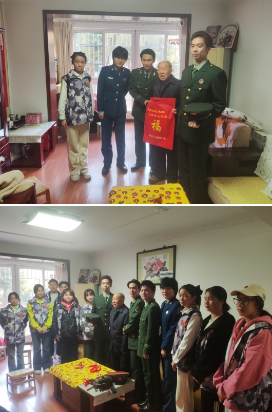 此次活動是棲霞區(qū)退役軍人事務(wù)局、馬群街道退役軍人服務(wù)站、果場社區(qū)退役軍人服務(wù)站、南京財經(jīng)大學(xué)聯(lián)合開展的尋訪抗美援朝老兵志愿服務(wù)活動。在曾老的家中,大學(xué)生志愿者們與曾爺爺親切交談,認真聆聽記錄著九旬高齡曾老講述奔赴朝鮮為國而戰(zhàn)的故事。志愿者們問增老:剛到戰(zhàn)場上,聽到槍炮聲,您會怕嗎?曾老回答說:“那是自己年齡還小,還不太懂,一開始也有些怕,但看到大家都往上沖,自己也就不怕了,現(xiàn)在身體里還留有兩枚彈片。”戰(zhàn)爭是異常殘酷的,在抗美援朝的戰(zhàn)場中,有多少志愿軍的指戰(zhàn)員赴湯蹈火,視死如歸,把生命都留在了朝鮮。4名退役復(fù)學(xué)的大學(xué)生志愿者對曾老浴血榮光的革命精神用軍禮表達了崇高的敬意,感謝他為祖國做出重大貢獻,并表示一定會努力學(xué)習(xí)文化知識,珍惜當(dāng)下的美好生活,要銘記抗美援朝戰(zhàn)爭的艱辛歷程和偉大勝利,弘揚偉大的抗美援朝精神。