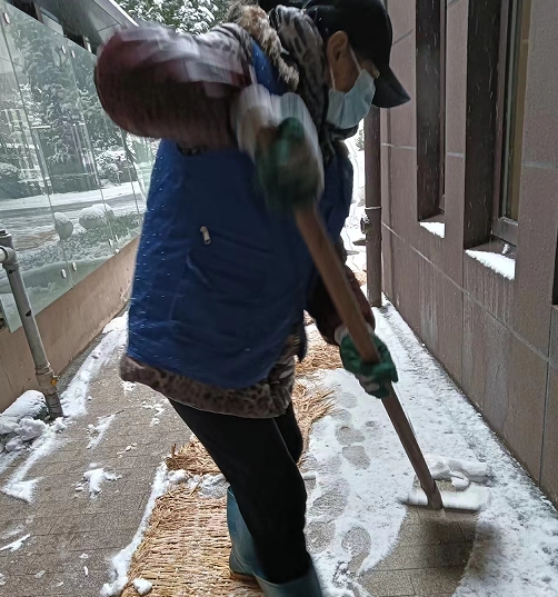 在12月18日中午,向上社區(qū)已經(jīng)和鴻福城物業(yè)就積雪一事召開臨時會議,動員社區(qū)工作人員、物業(yè)工作人員、退役軍人、積分制志愿者組成一支支驍勇善戰(zhàn)的“破冰”沖鋒隊,在寒意逼人的冬日里“雪中起舞”,全力開展清雪除冰工作。要求于16時開始清掃主干道以及人行道積雪,于19日6時繼續(xù)清掃積雪。