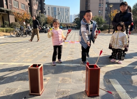 活動(dòng)現(xiàn)場(chǎng),參與者們熱情高漲,孩子們更是興奮不已。由職工志愿者介紹本次活動(dòng)共分為四個(gè)環(huán)節(jié):投壺、套圈、三子棋、珠行萬(wàn)里。在投壺環(huán)節(jié),每組家庭成員需要在最短時(shí)間內(nèi)完成投壺,這是一種禮節(jié)性的游戲,通過(guò)投矢的方式?jīng)Q定勝負(fù)。套圈環(huán)節(jié),是以每組家庭成員最短時(shí)間內(nèi)完成最多套圈數(shù)量衡量,游戲不僅鍛煉了大人、孩子們的身體平衡能力,還大大激發(fā)了孩子們對(duì)游戲的趣味挑戰(zhàn)和探索欲,促進(jìn)他們的身心發(fā)展。