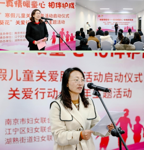 啟動(dòng)儀式伊始,區(qū)婦聯(lián)夏主席上臺(tái)致辭,她代表江寧區(qū)婦聯(lián),對參與此次活動(dòng)的領(lǐng)導(dǎo)、來賓和孩子們表示熱烈歡迎和美好祝愿。夏主席表示,江寧區(qū)各級(jí)婦聯(lián)組織一直高度重視兒童關(guān)愛工作,尤其是困境(留守)兒童的關(guān)愛。夏主席希望全區(qū)各級(jí)婦聯(lián)積極發(fā)動(dòng)社會(huì)力量參與,提供心理疏導(dǎo)、家庭教育指導(dǎo)等關(guān)愛服務(wù),切實(shí)將關(guān)愛送到每個(gè)家庭和兒童身邊。隨后,現(xiàn)場發(fā)布了南京市各區(qū)婦聯(lián)寒假兒童關(guān)愛服務(wù)內(nèi)容,讓在場的家長和孩子們更加了解各項(xiàng)服務(wù)和活動(dòng)安排。