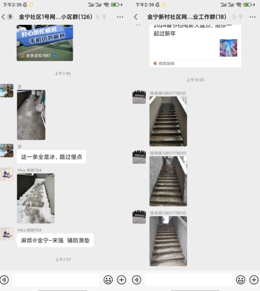 金寧新村社區(qū)未“雪”綢繆,提前部署,購置了融雪劑、草墊、鏟雪鍬等物資,通過“掌上云小程序”、“掌上云社區(qū)”微信群向居民發(fā)送雨雪冰凍特別提醒,同時落實班子成員輪流帶班,加強值班巡查,積極應(yīng)對突發(fā)情況。“這條路上全是冰,路過慢點”在305號小區(qū)微信群里一位居民信息發(fā)到,隨后志愿者、物業(yè)工作人員立即來到小區(qū),拿著掃帚、鐵鍬,一鏟一掃的清理路上的積雪,很快就為居民清掃出了一條“平安路”。雖然天氣寒冷,但志愿者們的熱情絲毫不減,他們用自己的實際行動為社區(qū)的安全和暢通貢獻著自己的力量。