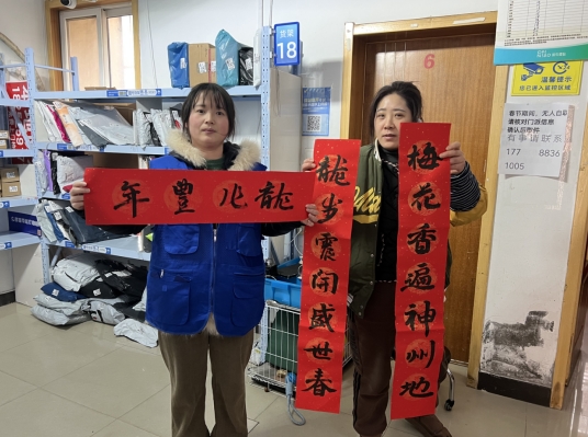 社區(qū)職工志愿者們深入到快遞驛站,為辛勤工作的員工們送上了寓意吉祥如意的春聯(lián)。這些精心挑選的對(duì)聯(lián),字里行間洋溢著溫馨與幸福,傳遞著濃濃的節(jié)日祝福,為即將到來(lái)的春節(jié)增添了無(wú)盡的喜慶氣氛,也為大家?guī)チ藵M滿的福氣與誠(chéng)摯的祝愿。