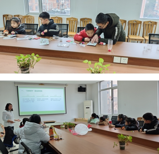 活動開始,社工通過PPT向孩子們介紹了從無廢城市走向無廢社會的提出背景和重大意義。“無廢校園”是建立在“無廢城市”概念基礎(chǔ)上,是一種先進的校園理念,通過師生自覺踐行資源節(jié)約、環(huán)境友好、簡約適度、綠色低碳的生態(tài)文明生活行為習(xí)慣,在校園中達成廢棄物的“可見、可減、可用、可消”,最終實現(xiàn)整個校園廢物產(chǎn)生量減少、資源充分利用、安全處置的目標(biāo)。接下來,社工帶領(lǐng)孩子們動手利用空的礦泉水瓶制作小吸塵器,利用紙杯制作小臺燈,積極倡導(dǎo)“無廢”理念,培養(yǎng)孩子們自覺投入到“無廢學(xué)校”建設(shè)的宣傳和實踐中去。
