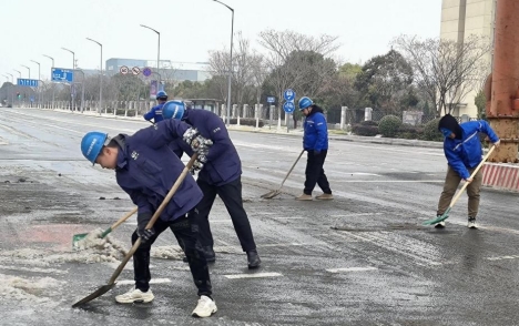 盡管氣溫低下,且雨雪在車輛的碾壓下在路面上形成厚厚的冰層,給清掃工作帶來極大的困難。但項目部全體員工仍信心十足,通過精心組織,分工合作,明確各自的負責區(qū)域后全身心的投入到除雪工作中。鐵鍬與道路的撞擊聲,掃帚與積雪的摩擦聲共同構成了一曲清冰除雪的激昂樂章,給清掃積雪也注入了無限的動力。經(jīng)過項目員工的不懈努力,項目施工區(qū)域周圍道路上的積雪積冰已清掃完成,極大的消除了道路上的安全隱患,用實際行動為群眾清掃了一條便民路。同時,為防止道路再次結冰,項目部也安排人員對已清掃道路進行撒鹽防凍,切實保障道路安全,在嚴寒中守護市民出行安全。