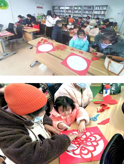 故事會(huì)前,老師先帶領(lǐng)孩子們一起做熱身活動(dòng)手指謠,充分調(diào)動(dòng)了孩子的積極性。之后志愿者老師繪聲繪色地講解了繪本《春?!?,故事以除夕為舞臺(tái),講述掉落人間的精靈小福氣,在孤單無助的夜里走進(jìn)了狐貍面館,因?yàn)樾『偟纳屏己头窒?,小福氣發(fā)現(xiàn)了不一樣的自己,通過自我成長(zhǎng)創(chuàng)造了不可思議的幸福除夕。志愿者老師在閱讀過程中積極引導(dǎo)家長(zhǎng)與孩子互動(dòng),共同探討故事情節(jié),并通過角色扮演,讓孩子深入理解人物性格,感受到福氣傳遞的幸福和美好,明白了溫柔和善良有著不可思議的力量。最后,老師帶領(lǐng)著孩子和家長(zhǎng)一起剪窗花,進(jìn)一步加深了孩子們對(duì)中國(guó)傳統(tǒng)文化的了解。