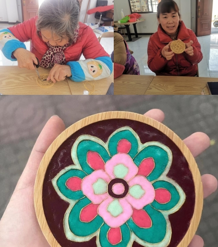 在掐絲琺瑯手工制作中,志愿者老師為大家講解了掐絲琺瑯的歷史淵源、發(fā)展歷程和掐絲等工藝流程。婦女阿姨們躍躍欲試,在老師的指導(dǎo)下,每個(gè)人都小心地拿起金絲線,按照底板的輪廓勾勒出一個(gè)一個(gè)線條,掐絲、注膠、調(diào)沙、上色,在一個(gè)半小時(shí)的制作過(guò)程中,大家相互交流,互幫互助,興致盎然,盡情享受著親手創(chuàng)作的樂(lè)趣。