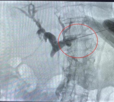 由于患者肝右葉占位巨大,完全遮擋右側(cè)穿刺路徑,左肝管為唯一穿刺路徑。介入科彭鵬醫(yī)生與重癥醫(yī)學(xué)科討論后,征得患者家屬同意后,擬行左側(cè)經(jīng)皮肝內(nèi)膽管穿刺引流術(shù)。術(shù)中一針便成功進(jìn)入膽道系統(tǒng),導(dǎo)絲引流管放置順利,造影顯示膽道系統(tǒng)顯影滿意,側(cè)孔位置可,引流順暢,37分鐘便結(jié)束了手術(shù),術(shù)后順利轉(zhuǎn)入普外科護(hù)理治療。這例手術(shù)的成功開展,刷新了該院介入團(tuán)隊(duì)高齡患者手術(shù)的新記錄!