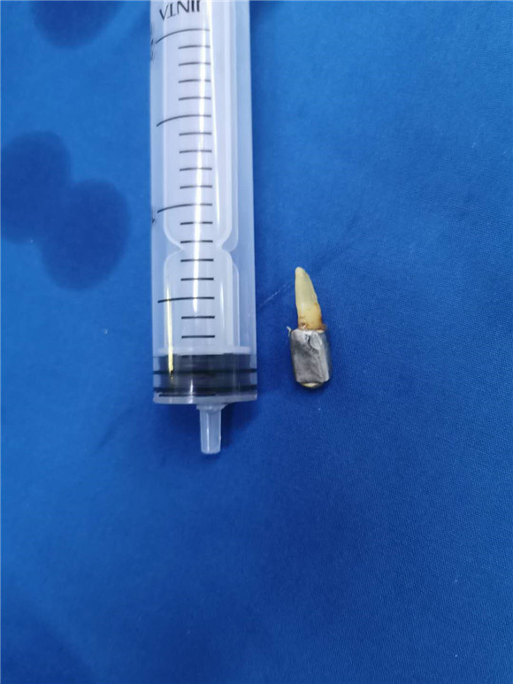 當(dāng)天下午手術(shù)正式開(kāi)始,電子支氣管鏡順利進(jìn)入患者氣道,發(fā)現(xiàn)假牙嵌頓于右主支氣管,右肺通氣功能幾近喪失。在劉盼盼的協(xié)助下,楊旸用異物鉗夾住假牙尖端,假牙有松動(dòng)但無(wú)法直接鉗出。隨后決定更換圈套器,圈住假牙的中間部位,收緊圈套器固定住假牙,將假牙與氣管套管一起取出。最后,楊旸使用電子支氣管鏡二次進(jìn)入氣道,見(jiàn)假牙嵌頓處已有肉芽組織生成,給予鏡下清理肉芽組織和分泌物后退鏡結(jié)束操作,整個(gè)操作過(guò)程不超過(guò)五分鐘。復(fù)蘇后,患者呼吸困難得到顯著改善。