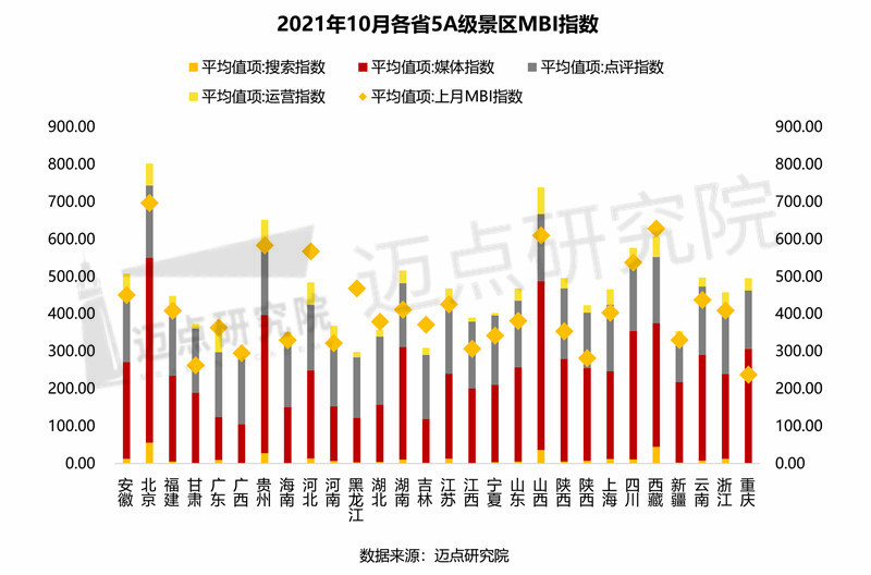 “2021年10月5A級景區(qū)品牌100強榜單”數(shù)據(jù)來源于邁點品牌指數(shù)MBI,根據(jù)10月邁點品牌指數(shù)MBI的306個5A級景區(qū)數(shù)據(jù)匯總統(tǒng)計而成。具體說明如下: