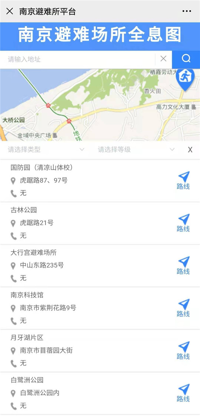 這么多應(yīng)急避難場(chǎng)所,如何查詢哪一處離你最近呢?記者了解到,市民可以關(guān)注“南京建設(shè)”微信公眾號(hào),點(diǎn)擊右下角的“微服務(wù)”,選擇“應(yīng)急避難所”,就可以查詢到周邊的避難場(chǎng)所分布。
