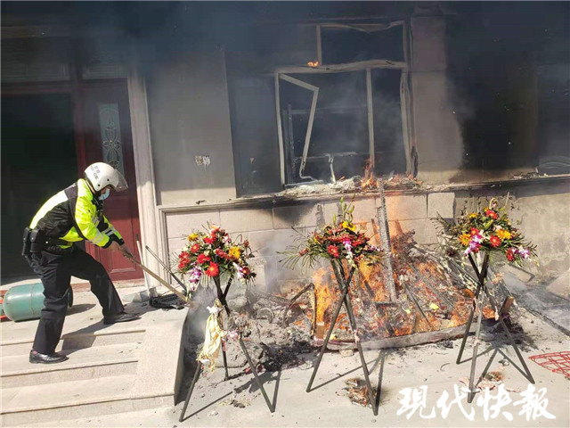 處警人員見情勢(shì)危急,立即拿起周圍一切可用的工具進(jìn)行滅火。有民警找來(lái)拖把奮力拍打火焰,輔警則找來(lái)垃圾桶接水滅火。