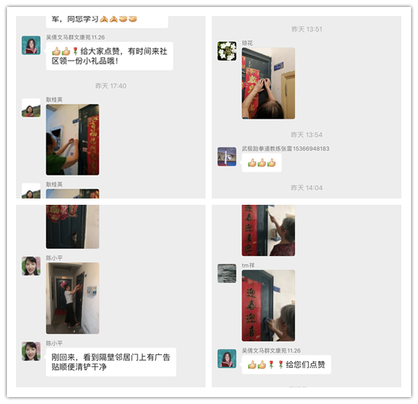 文明創(chuàng)建,黨員先行。社區(qū)通過掌上云社區(qū)在群里號(hào)召居民自行清理自己門上的小招貼,為文明城市創(chuàng)建添磚加瓦。轄區(qū)黨員們積極響應(yīng)黨總支號(hào)召,紛紛走出家門清理自家或鄰居家門上的小招貼。并及時(shí)在群里分享自己的助力成果,由于黨員帶頭的先鋒作用,居民們也積極加入其中,為文明創(chuàng)建獻(xiàn)上自己的一份力。