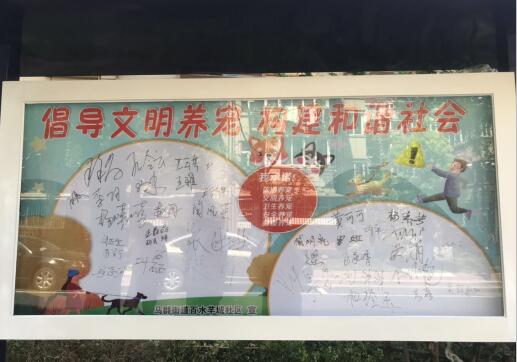 活動最后,在場的寵物主們在“倡導(dǎo)文明養(yǎng)寵 構(gòu)建和諧社會”我承諾看板上簽下了自己的名字,承諾依法養(yǎng)寵、文明養(yǎng)寵、衛(wèi)生養(yǎng)寵、安全養(yǎng)寵、健康養(yǎng)寵。活動結(jié)束后社區(qū)將宣傳看板放置在社區(qū)宣傳欄內(nèi)對外展示,希望喚起小區(qū)內(nèi)的寵物主們的自發(fā)參與“文明養(yǎng)寵”的意識。