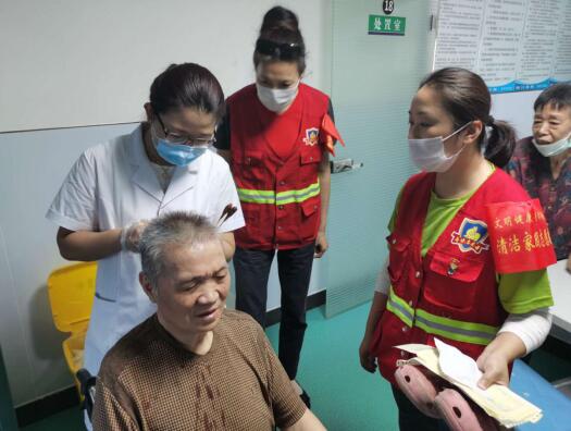 全科社工第一時間到達(dá)現(xiàn)場并立即用手機(jī)叫車軟件幫助老人叫了一輛車。因擔(dān)心老人發(fā)生不可知的狀況,隨后兩位敬老助殘志愿者協(xié)助家屬將老人攙扶下樓,一路護(hù)送到醫(yī)院,全程陪同老人急診就醫(yī)。同時聯(lián)系上老人住在市區(qū)的女兒,告知其老人現(xiàn)在受傷的狀況。在萬壽醫(yī)院做完一系列檢查和清創(chuàng)包扎后大家又一起將老人安全護(hù)送回家。