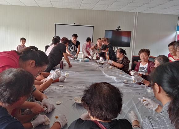 為表現(xiàn)闔家團圓、喜慶豐收和對美好生活向往的主題,講座結束后,迎來今年中秋的特別活動——DIY冰皮月餅的制作。社區(qū)工作人員將準備好做月餅的原料、豆沙、黑芝麻餡料、手套、模具等材料一一擺放好。在工作人員的指導下,現(xiàn)場示范制作制作手工冰皮月餅的技巧,為大家詳細講解了月餅的制作過程后,便開始親自動手。按照步驟:揉面團、包餡、放模具內(nèi)按壓成型。大家第一次看到做月餅,心情激動,都迫不及待想要體驗一番。大家圍成一桌,學著面點老師教的方法和步驟一起開始做月餅。在場的居民在制做的過程中都很細致和認真,生怕一不小心用力過猛,捏壞了,大家看到自己第一次制作的冰皮月餅,從自己手中成型,都異常興奮和滿足。做完后很多居民迫不及待的就開始吃了起來。從做月餅到吃月餅的一套流程讓居民朋友們以另外一種方式體驗了中國傳統(tǒng)佳節(jié)的魅力和美好。