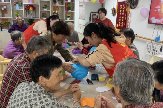 大家一邊聽講解,一邊開始動手制作,有些燈籠配件比較小一些,部分參與活動的老人因?yàn)槟昙o(jì)大看的不太清晰,全科社工協(xié)助老人貼到燈籠上,居民之間也相互幫助,活動氣氛很是融洽。