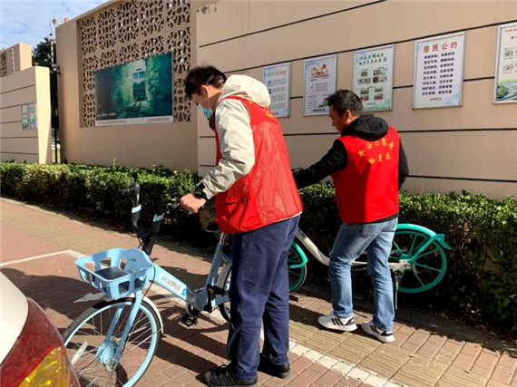 活動過程中,穿著藍馬甲的志愿者和穿著紅馬甲的社區(qū)工作人員有的在河道邊撿拾堆積的塑料袋、塑料瓶、廢紙等垃圾,有的清理、挪動道路旁亂停的自行車和電動車,還有的則撿拾小區(qū)內(nèi)綠化帶中的垃圾。為了改善社區(qū)內(nèi)的環(huán)境衛(wèi)生,大家不怕臟不怕累,很快,草地上的垃圾就不見了,路邊停的非機動車也變得十分整潔有序。