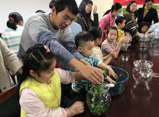 活動邀請了社區(qū)的腌菜高手李奶奶和季奶奶,他們手把手教著小朋友,先摘葉、再切根、再洗凈、再瀝干。接著小朋友和家長、黨員志愿者一起,在菜里撒上適量的鹽,小手和大手一起,攪拌揉搓加了鹽的菜,最后一起將菜裝入玻璃菜壇中。
