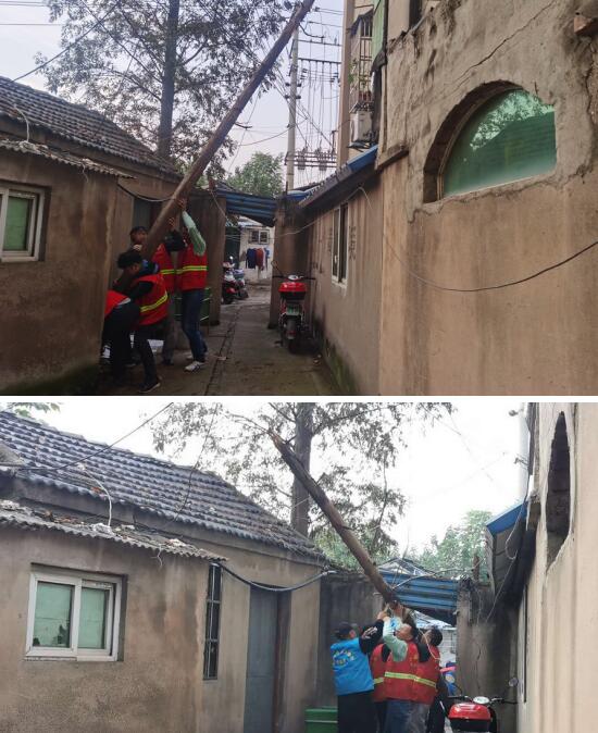 為了盡快消除安全隱患,全力守護(hù)居民生命財(cái)產(chǎn)安全,棲霞區(qū)燕子磯街道石化村社區(qū)立即組織安全員和志愿者趕赴現(xiàn)場(chǎng)勘查,發(fā)現(xiàn)水杉數(shù)長(zhǎng)在郝師傅家平房的墻根處,經(jīng)過多年的生長(zhǎng),樹根已拱裂水泥地面,接近樹根的位置有蟲蛀的孔洞,樹身已經(jīng)傾斜,顫顫巍巍的搭在電纜線上,樹梢接近對(duì)面的小二樓的房頂,看起來隨時(shí)可能發(fā)生倒伏,社區(qū)立即處置,安排人員對(duì)危樹進(jìn)行排危。