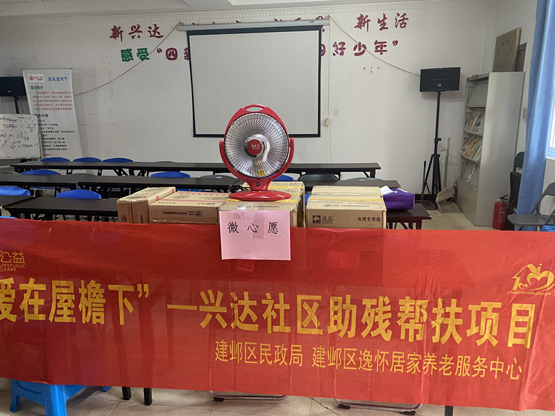 楊某與母親均為興達(dá)社區(qū)智力殘障居民,母親還伴有中風(fēng),常年臥病在床,家里只有父親是唯一的正常人士,在照顧母子倆生活的間隙靠打零工維持家用,家庭條件及其艱苦。隨著冬季的到來,氣溫逐漸下降,在寒冷的冬季能夠有一個(gè)取暖器給癱瘓?jiān)诖驳钠拮尤∨彩呛苌莩薜氖虑椤?2月5日,興達(dá)社區(qū)聯(lián)合“愛在屋檐下”項(xiàng)目組為楊磊這樣的困難殘疾人家庭送來了小太陽取暖器,用愛心、細(xì)心、關(guān)心接力讓冬季不再寒冷。
