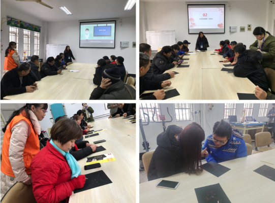 活動(dòng)開始,志愿者通過小視頻帶領(lǐng)殘友們了解“精神分裂癥”的含義、以及精神分裂癥對(duì)日常生活的影響和精神分裂癥的有效治療方式,并鼓勵(lì)大家給予“精神分裂癥”人群關(guān)心和呵護(hù)。活動(dòng)還準(zhǔn)備了“刮刮樂”和“神秘的力量”等小游戲。“刮刮樂”,是一種新型的繪畫方式。學(xué)習(xí)刮畫的過程中,包含了視覺搜索、選擇、分配等能力,對(duì)于精神殘疾人而言是一項(xiàng)不錯(cuò)的練習(xí)。看到“黑紙”變成“彩色畫”,大家都驚嘆很神奇。有的殘友越刮越來勁,直到將一整張畫紙刮出了色彩鮮明的方格圖。有一位殘友用手中的竹簽筆在畫紙上寫道“希望我們每一位殘疾人都能開心快樂度過每一天”。不一會(huì)兒功夫,多姿多彩的圖畫作品就如魔術(shù)般躍然紙上。大家?guī)缀醵疾患s而同地在畫中表達(dá)了對(duì)彼此的美好祝愿。接著進(jìn)行“神秘的力量”,大家對(duì)心理暗示都感覺到非常好奇?;顒?dòng)最后,志愿者帶領(lǐng),每位殘友都握緊拳頭,放在胸前,一起喊出口號(hào):“我是一個(gè)積極進(jìn)取的人!”“我是一個(gè)勇敢的人!”“我是最棒的!”說完后,大家臉上都呈現(xiàn)出了一定的自信和氣勢(shì)。
