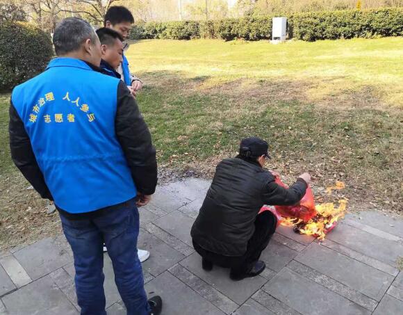 行動(dòng)中,志愿者穿著藍(lán)馬甲來(lái)到花港北路南灣營(yíng)公園進(jìn)行巡查。首先與正在準(zhǔn)備祭祀和已經(jīng)開(kāi)始祭祀的群眾溝通交流,向群眾普及森林防火知識(shí),提醒群眾在祭祀結(jié)束后仔細(xì)檢查灰燼堆,避免有火星存留,造成森林火災(zāi)隱患。隨后用枯樹(shù)枝認(rèn)真檢查了已經(jīng)祭祀完畢的灰燼堆,經(jīng)過(guò)兩個(gè)多小時(shí)的巡查,有效降低了森林火災(zāi)的風(fēng)險(xiǎn)。