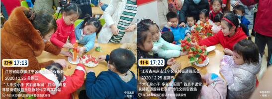 活動在手指謠《鈴兒響叮當(dāng)》中,拉開了序幕。現(xiàn)場,志愿者為小朋友們介紹了元旦新年節(jié)的由來,初步了解元旦新年節(jié)。同時,請小朋友相互交流自己對圣誕節(jié)的理解,說說為什么喜歡元旦新年節(jié)。隨后,孩子們開始制作蔬菜水果圣誕樹。孩子們將這些水果蔬菜蘸上了自己喜歡的顏色,利用他們各式各樣的形狀創(chuàng)作出了色彩斑斕的作品。面對自己的創(chuàng)作,大家流露出滿滿的喜悅和自信。此外,大家還共同合唱了《Jingle Bells》,激發(fā)小朋友的學(xué)習(xí)興趣,體驗(yàn)了大自然的魅力。