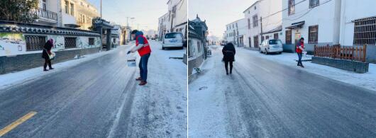 夜幕已經(jīng)降臨,風雪還在繼續(xù)。黨員、志愿者們充分發(fā)揮先鋒模范帶頭作用,拿起鐵鍬、鐵鏟,齊心協(xié)力進行路面清掃工作。鮮艷醒目的黨旗飄揚,與潔白的路面交相輝映,成為一道亮麗的風景線。直到天色露白,村內(nèi)道路終于恢復往日的整潔順暢,確保了村民正常的出行秩序。同時,黨員、志愿者們還不忘在路面撒上工業(yè)鹽,以防道路再次結(jié)冰。