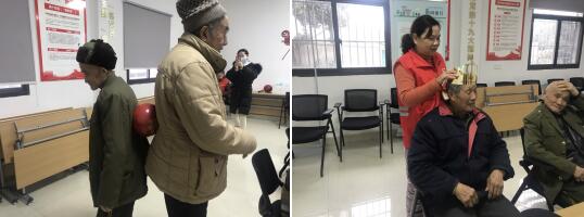 溫暖的祝福之后,隨即開始熱身小游戲。志愿者把老人兩兩一組,背靠背放一只氣球,要求從起點(diǎn)到終點(diǎn)合作完成,目的鍛煉老人的身體靈活性和協(xié)調(diào)性,由于動(dòng)作簡(jiǎn)單又富有趣味性,老人們立刻互動(dòng)起來(lái),把活動(dòng)氣氛推向了高潮。