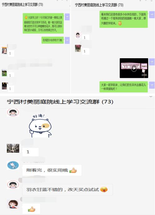 在學習交流群中,工作人員把提前錄制好的視頻發(fā)送給大家。跟隨工作人員的視角,居民們來到南京最大的花卉市場——江寧臺創(chuàng)園,里面五彩斑斕、品種多樣的花草樹木讓人應接不暇,恍惚間還以為置身春天。隨后,工作人員向大家介紹了冬季容易存活的花卉,如三色堇、角堇、礬根、報春花、羽衣甘藍等品種,并詳細地講解各類花卉的種植場景和養(yǎng)護方法,增進了大家對冬季種植的了解;其中“羽衣甘藍”深受大家喜愛,有居民表示要在課后嘗試種植。